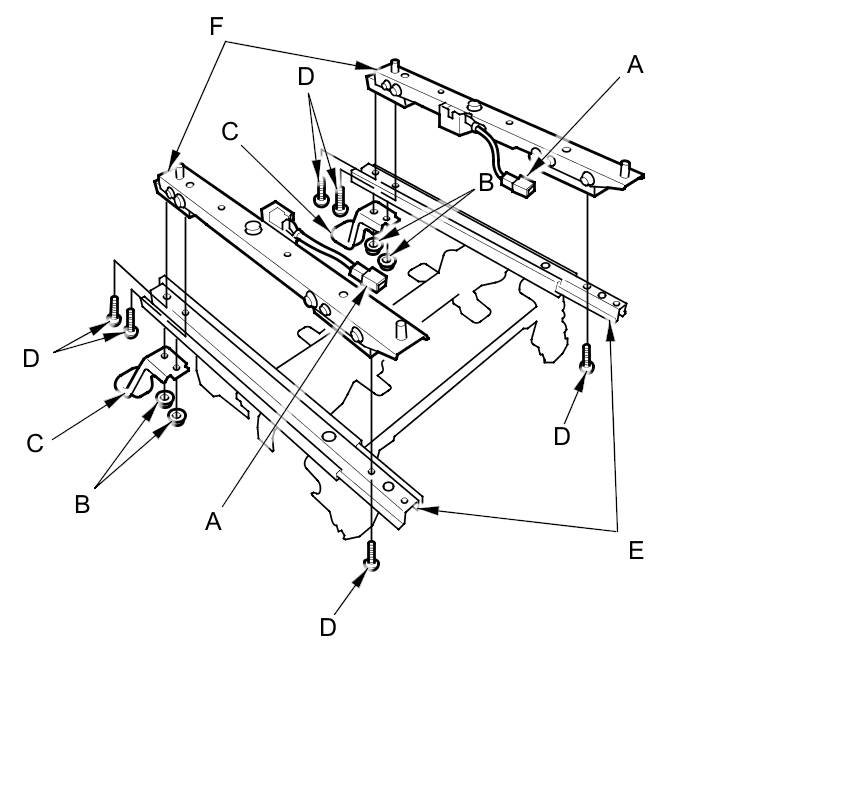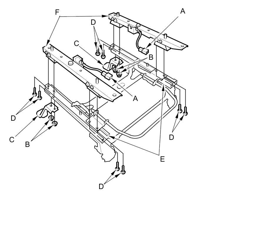 9. Remove the nuts (B) from the seat foot brackets (C), then using a TORX T27 bit, remove the tamper-resistant TORX bolts (D) that attach the seat slide/up-down adjusters (E) to the weight sensors (F).
