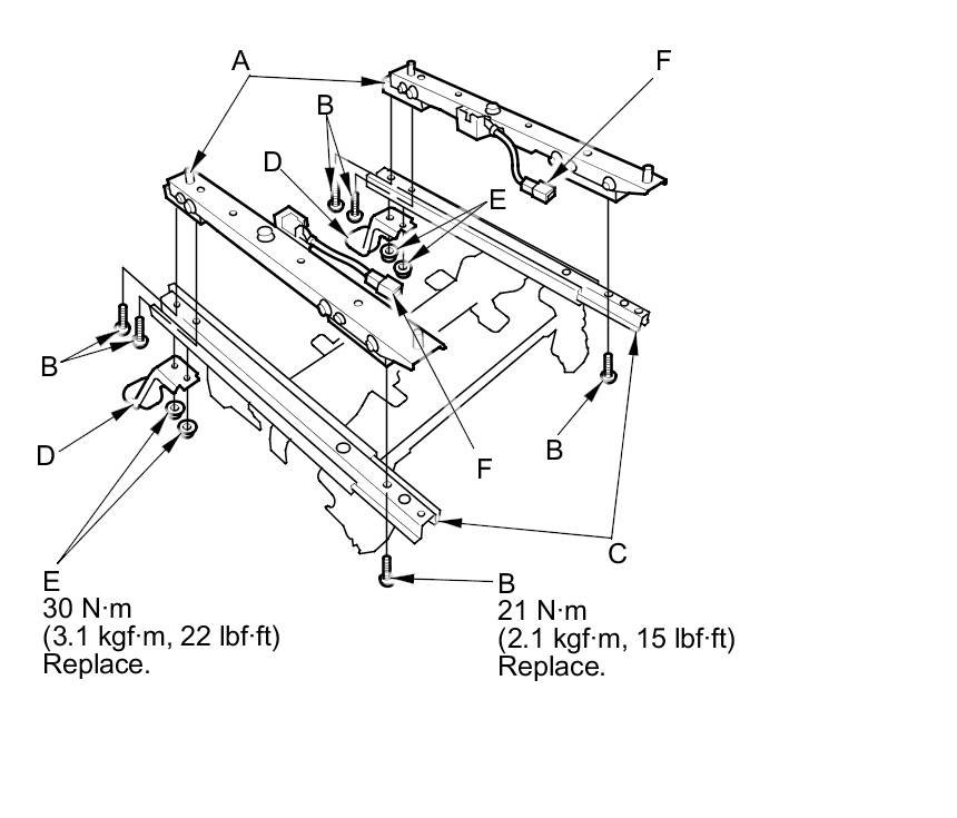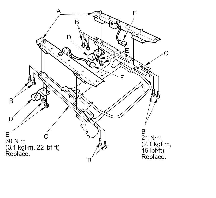 1. Install and torque the new front passenger's weight sensors (A) with new TORX bolts (B), using a TORX T27 bit under the seat slide/up-down adjuster (C), then install the seat foot brackets (D) with new nuts (E).