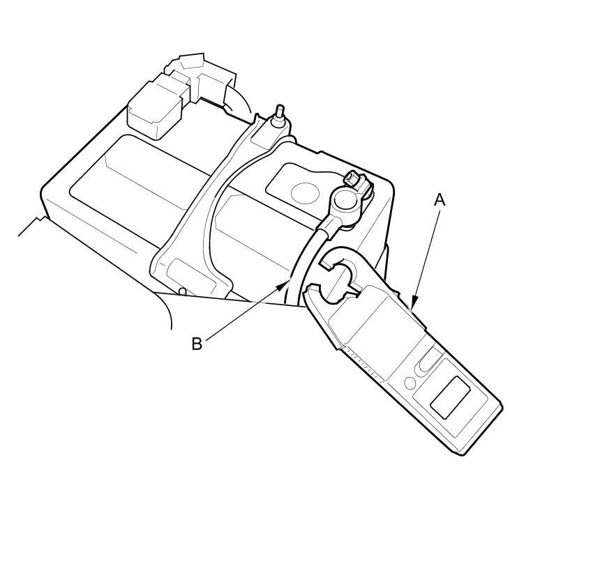 10. Attach the LH41 AC/DC low current clamp meter (A) to the battery ground cable (B). Follow the equipment manufacturer's instructions, then measure the parasitic draw.