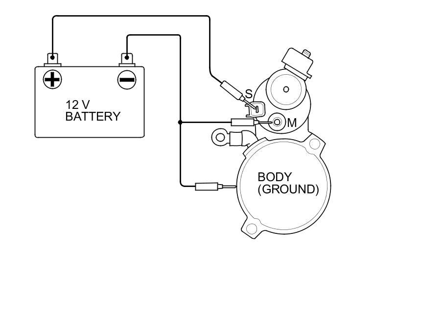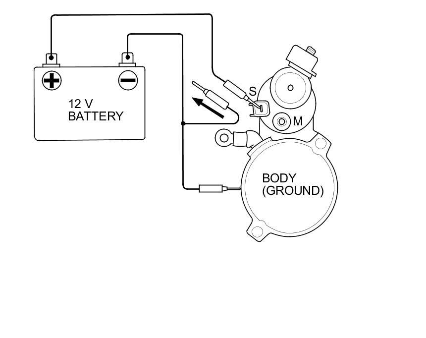 5. Connect the battery as shown. Make sure you disconnect the starter motor wire from the M terminal. If the starter pinion moves out, it is working properly.
