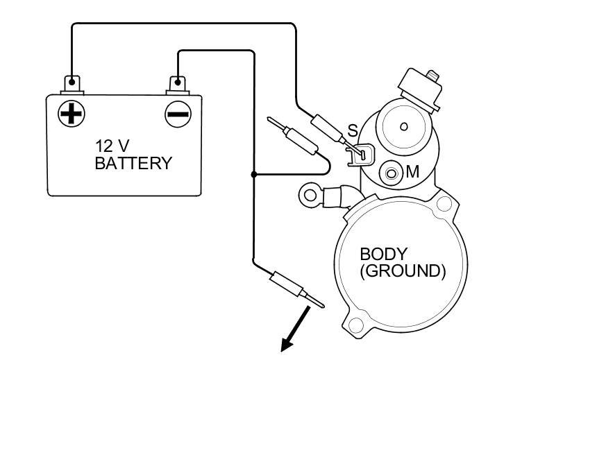 9. Connect the starter to the battery as shown, and confirm that the motor runs.