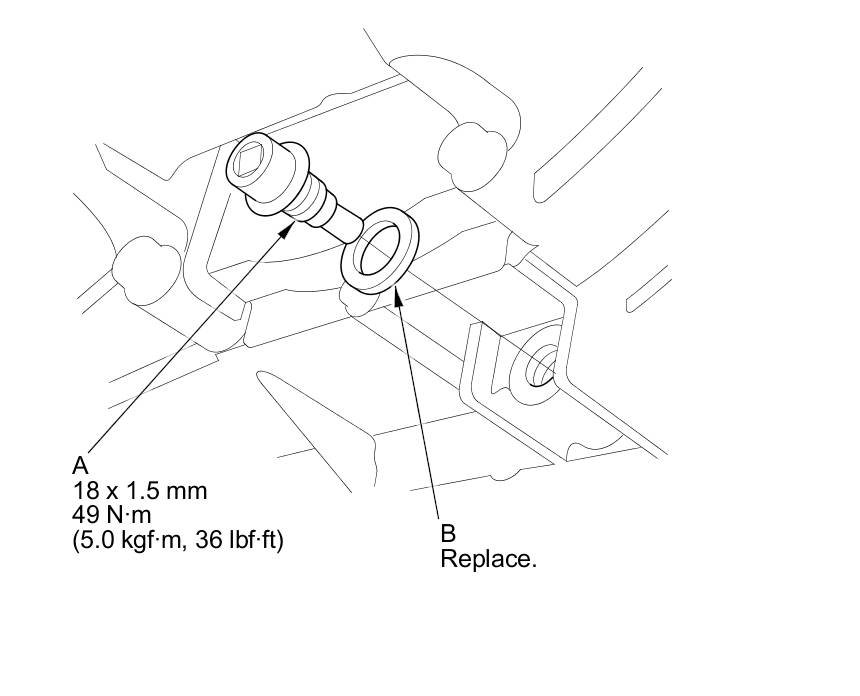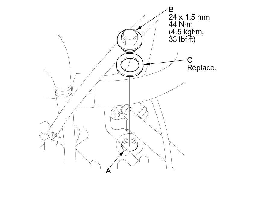 7. Install the ATF filler bolt (B) with a new sealing washer (C).