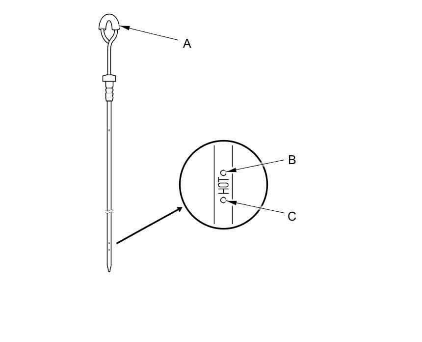 9. Make sure the ATF level is between the upper mark (B) and the lower mark (C) on the dipstick.