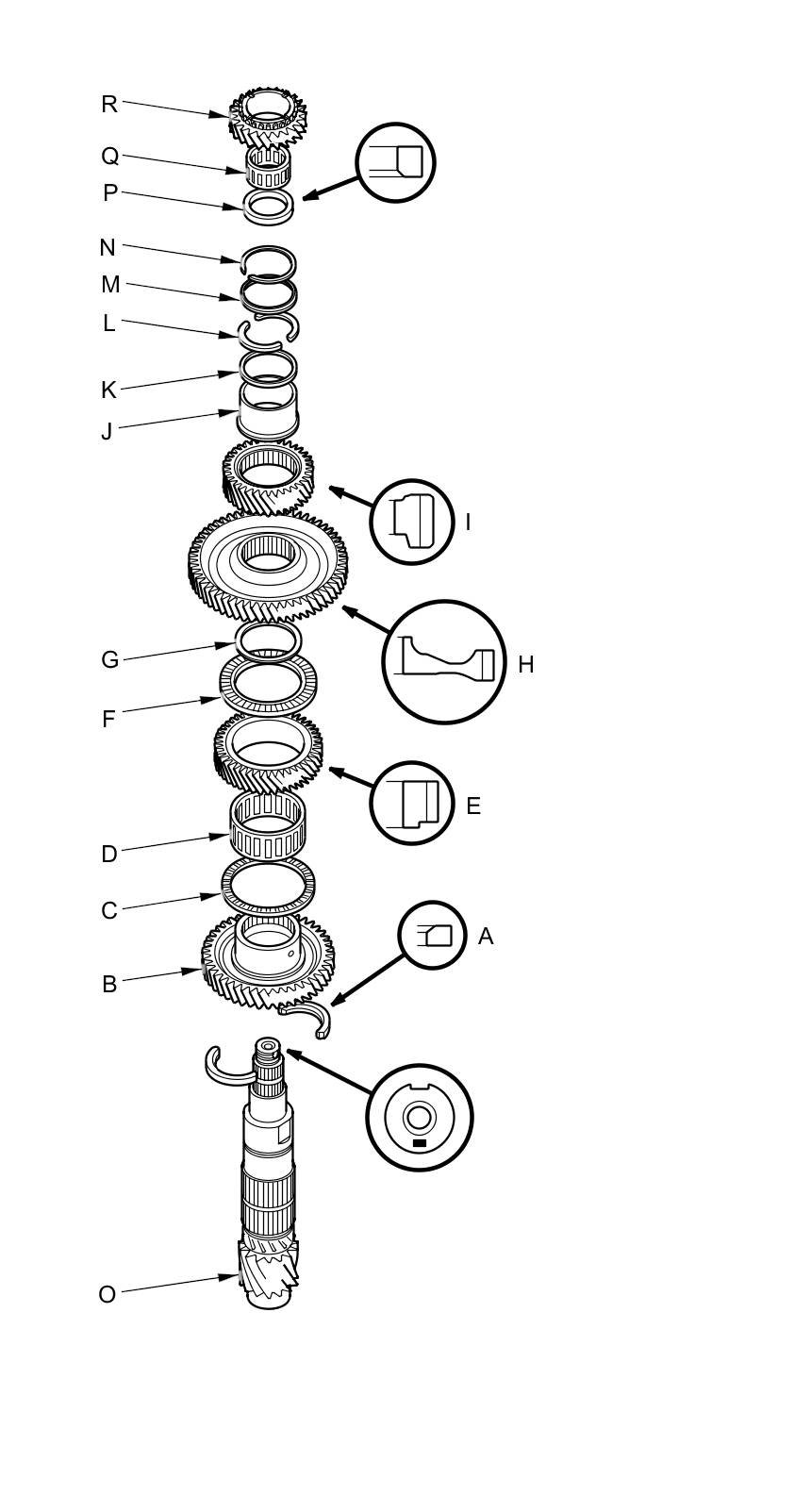 2. Install the thrust washer (P), the needle bearing (Q), and 5th gear (R).