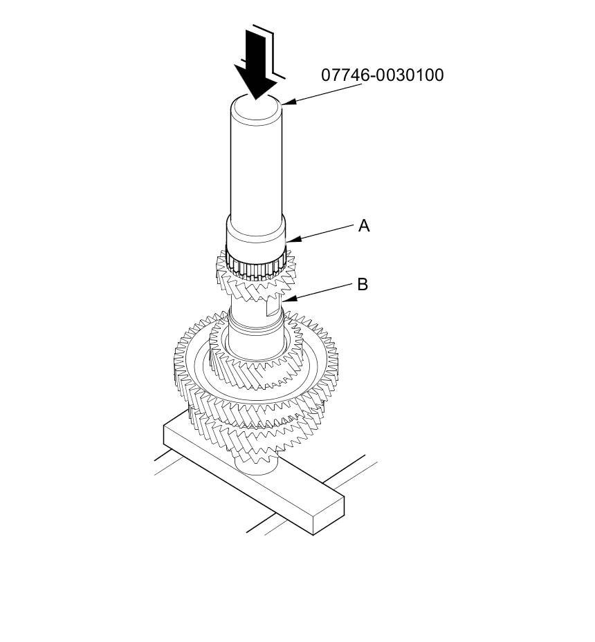 3. Slide the reverse selector hub (A) over the countershaft (B), then press it into place using the 40 mm I.D. driver handle and a press.