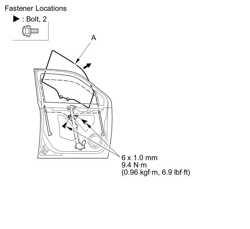 4. Carefully move the glass (A) until you can see the bolts, then remove them. Carefully pull the glass out through the window slot. Take care not to drop the glass inside the door.