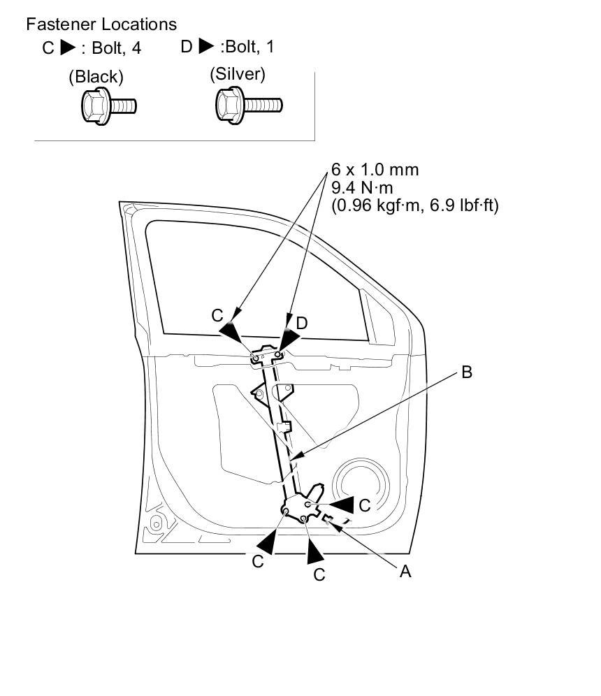 6. Remove the bolts (C), and loosen the bolt (D). Remove the regulator through the hole in the door.