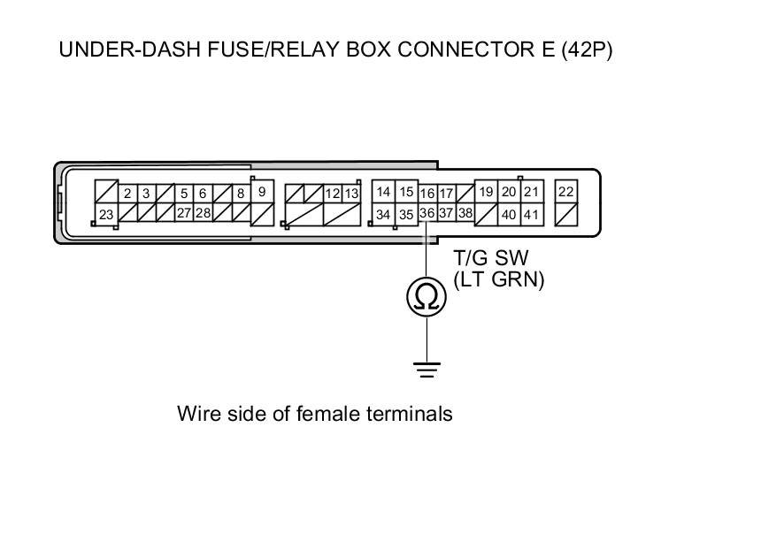 7. Check for continuity between under-dash fuse/relay box connector E (42P) terminal No. 36 and body ground.