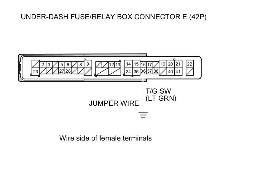 12. Connect under-dash fuse/relay box connector E (42P) terminal No. 36 and body ground with a jumper wire.