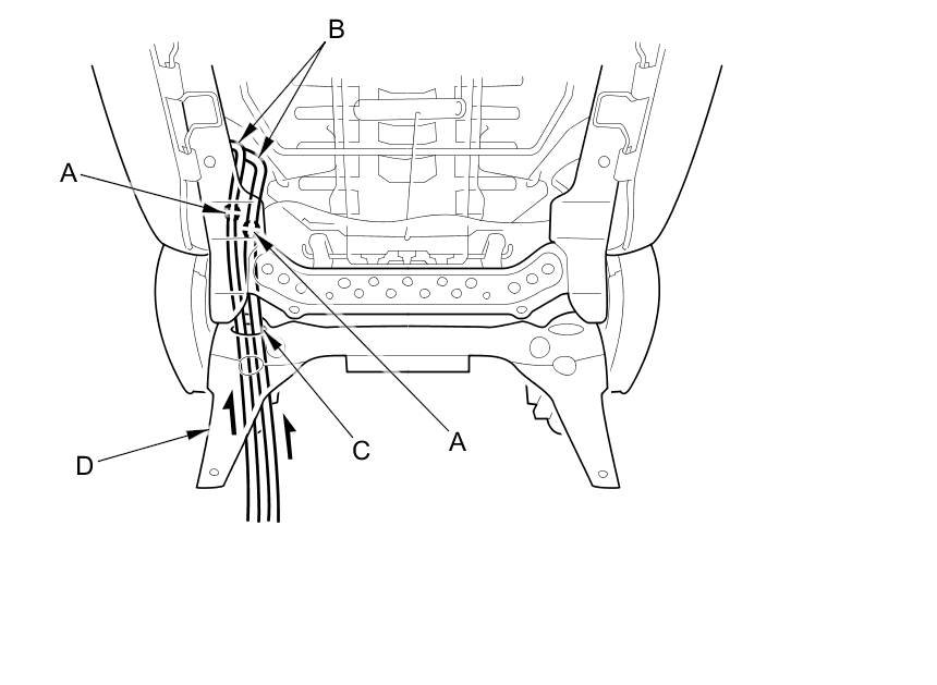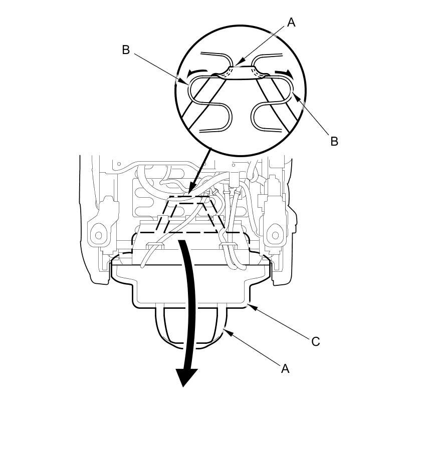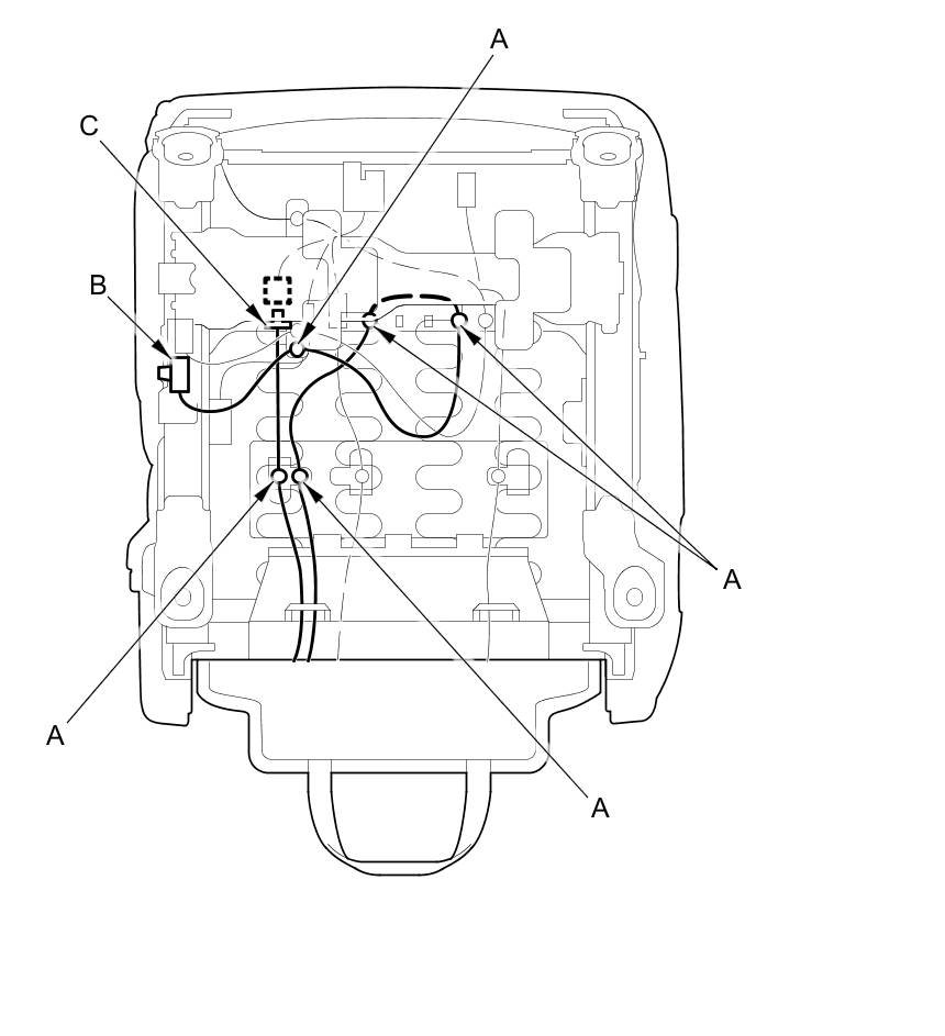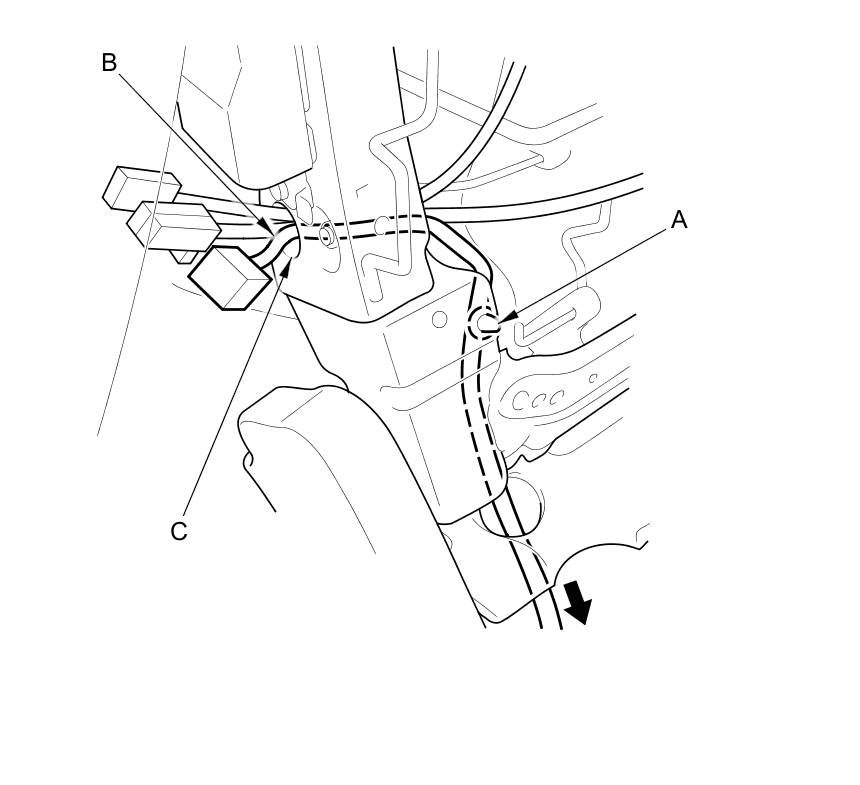 11. Passenger's seat: Detach the harness clip (A), then remove the seat wire harness (B) through the hole (C) in the seat frame.