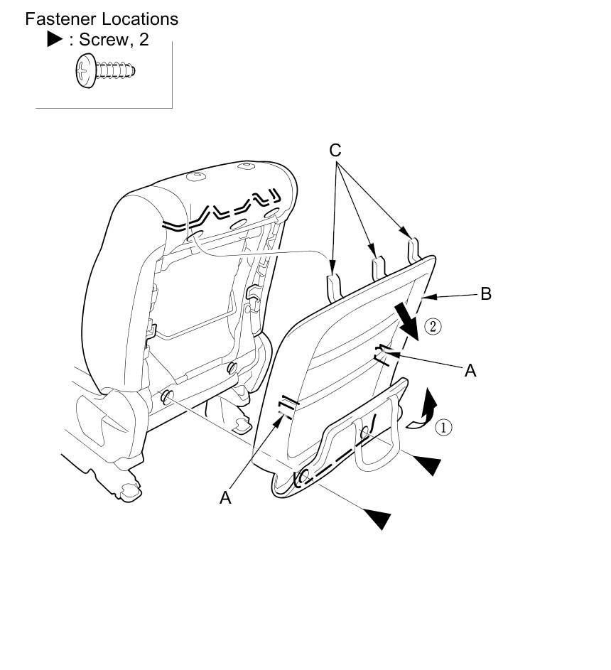 4. Remove the screws and release the hooks (A) by pulling the bottom of the back cover (B) back, then gently pull down the cover to release the hooks (C) from the seat-back frame, and remove the cover.