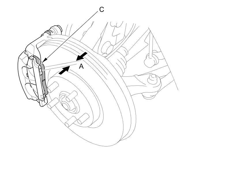 3. Check the thickness (A) of the inner pad (B) and the outer pad (C). Do not include the thickness of the backing plate.