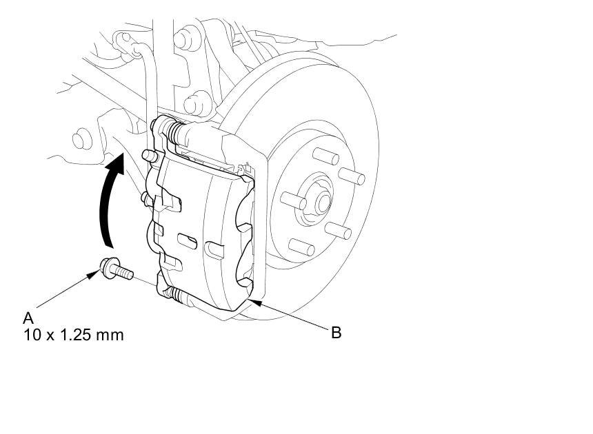 4. Remove the flange bolt (A), and pivot the caliper (B) up out of the way. Check the hose and the pin boots for damage and deterioration.