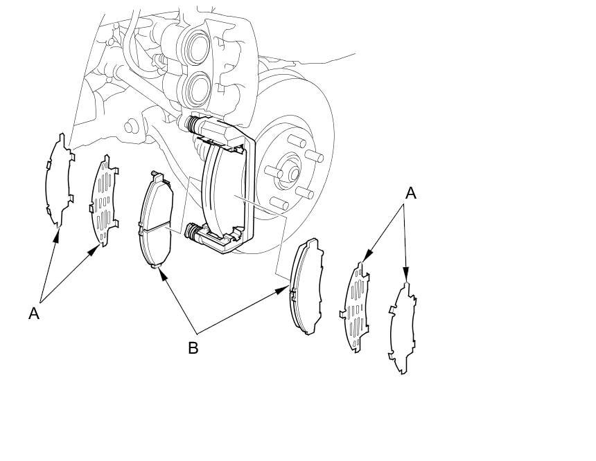 6. Remove the pad shims (A) and the brake pads (B).
