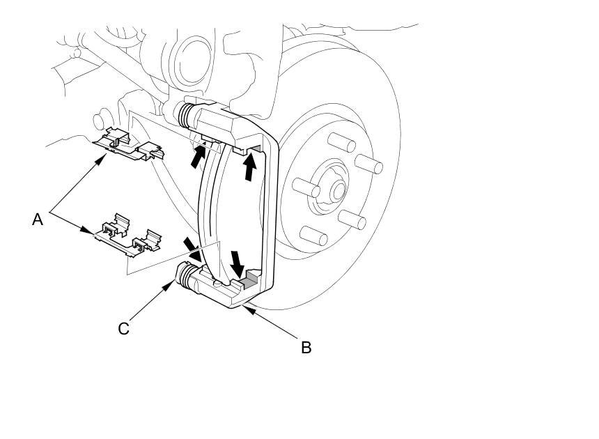 16. Install the brake pads and pad shims correctly. Install the brake pad with the wear indicator (C) on the upper inside. If you are reusing the brake pads, always reinstall the brake pads in their original positions to prevent a temporary loss of braking efficiency.