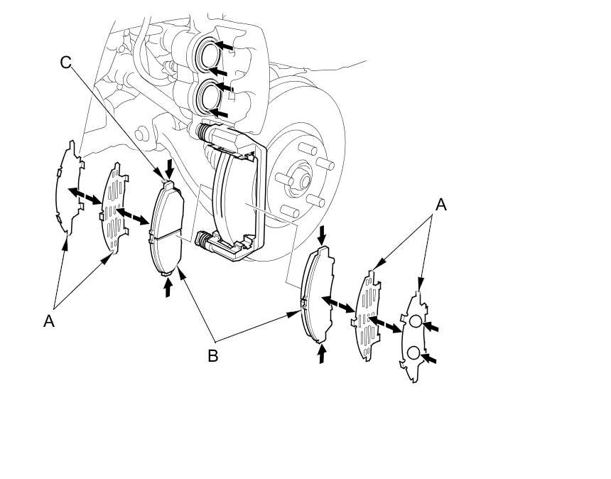 Verify that the caliper pins (C) move in and out smoothly. Clean and lube if needed.