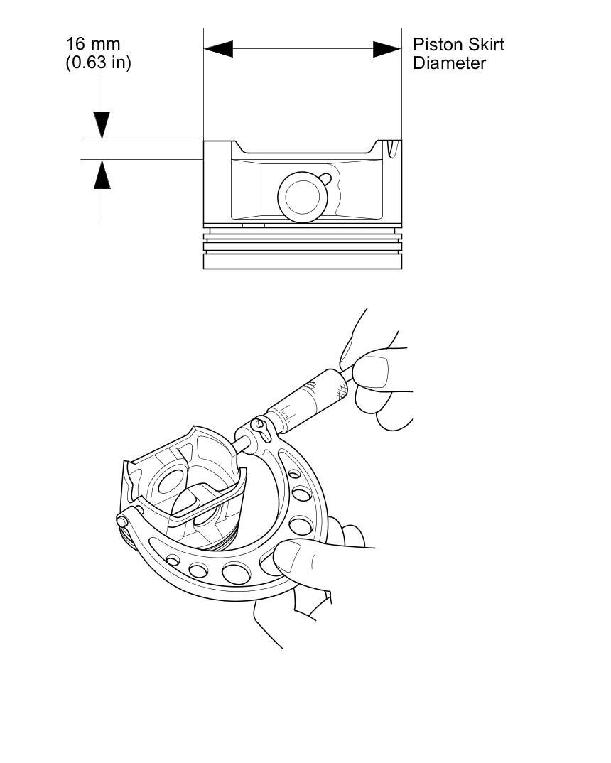 3. Measure the piston skirt diameter at a point 16 mm (0.63 in) from the bottom of the skirt.