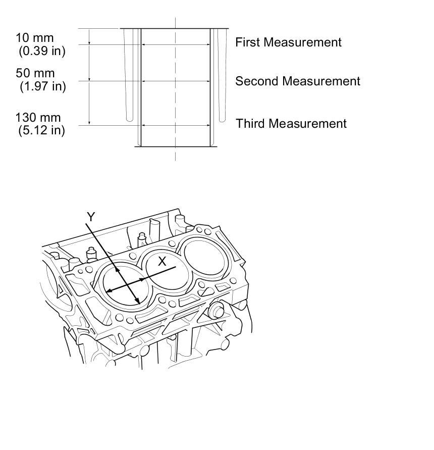 4. Measure the wear and taper in direction X and Y at three levels in each cylinder as shown. If measurements in any cylinder are beyond the oversize bore service limit, replace the engine block. If the engine block has to be rebored, refer to step 7 after reboring.