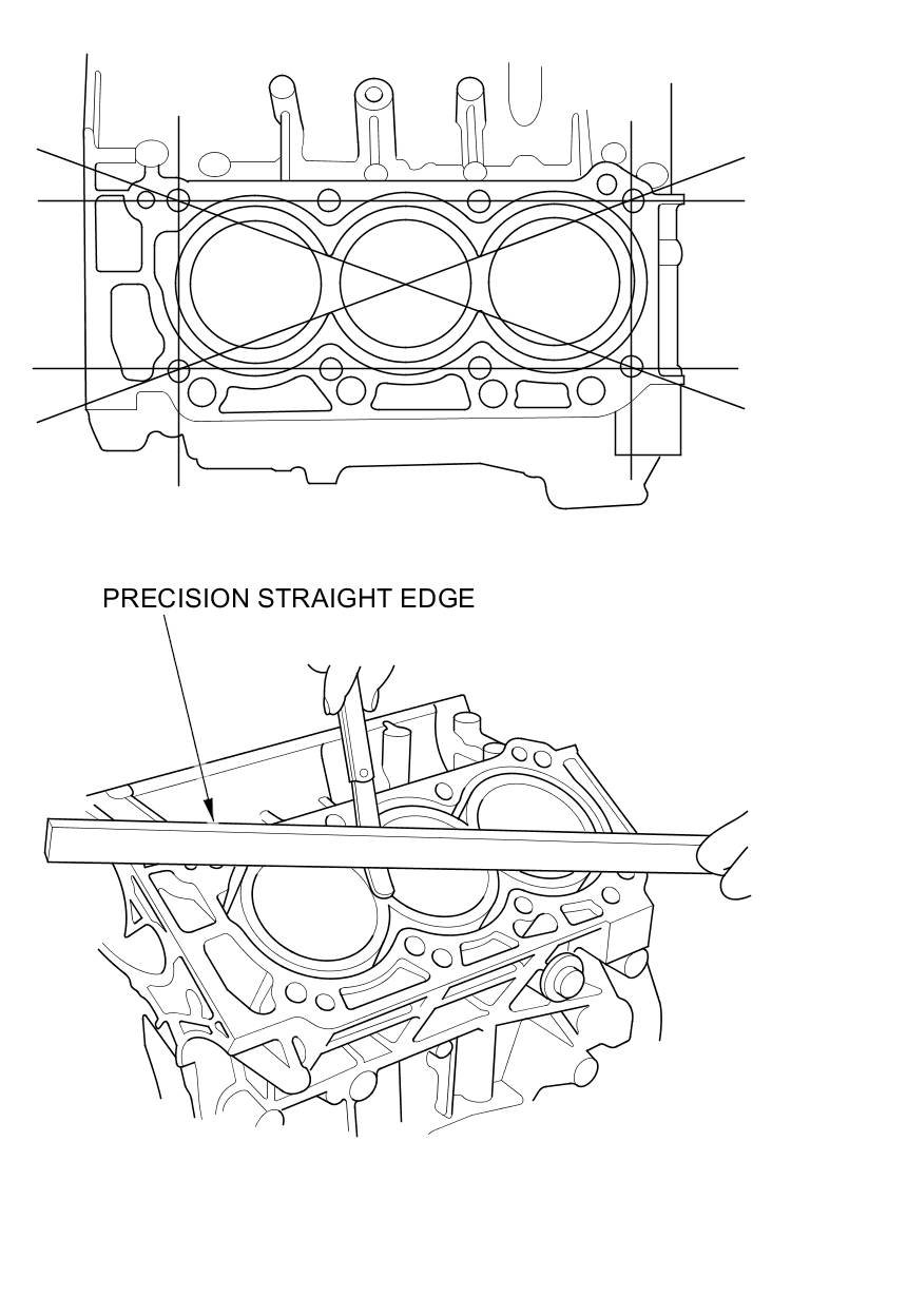 6. Check the top of the engine block for warpage. Measure along the edges and across the center as shown.
