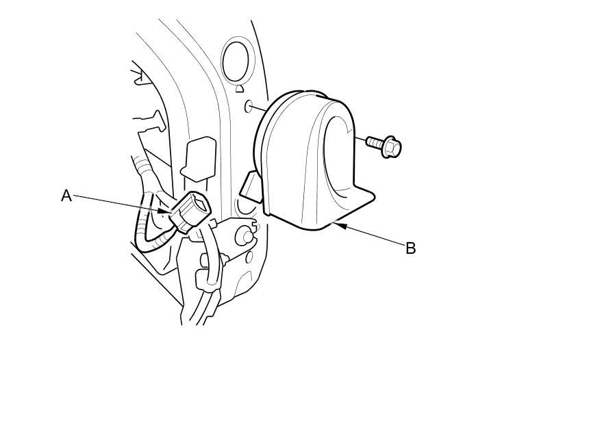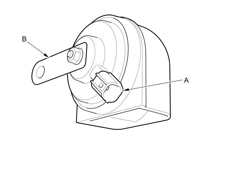 3. Test the horn by momentarily connecting battery power to the terminal (A) and grounding the bracket (B). The horn should sound.