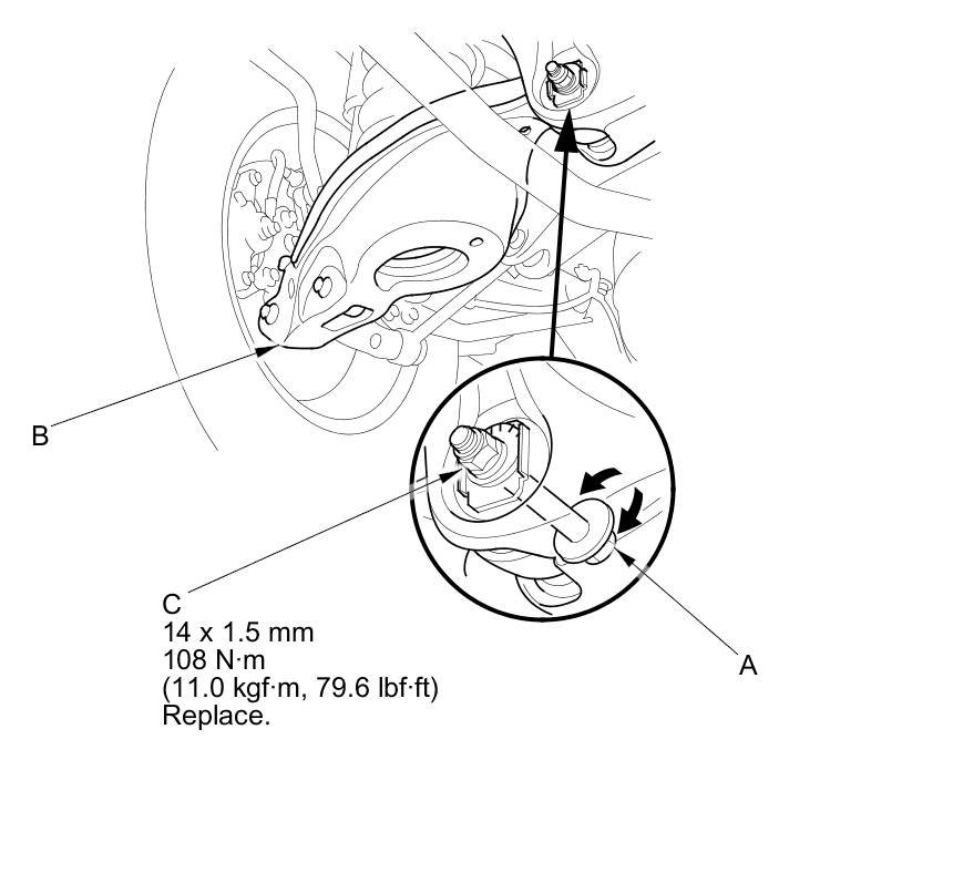 3. Hold the adjusting bolt (A) on the lower arm B, and loosen the self-locking nut (C).