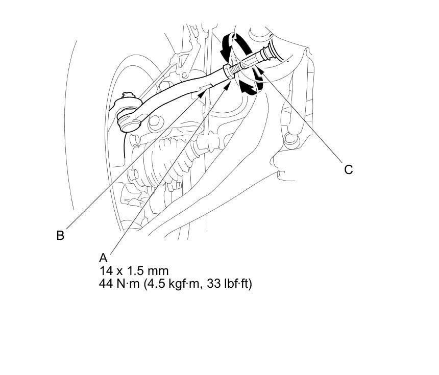 3. Loosen the tie-rod end locknuts (A) while holding the flat surface sections (B) of the tie-rod end with a wrench, and turn both tie-rods (C) until the front toe is within specifications.