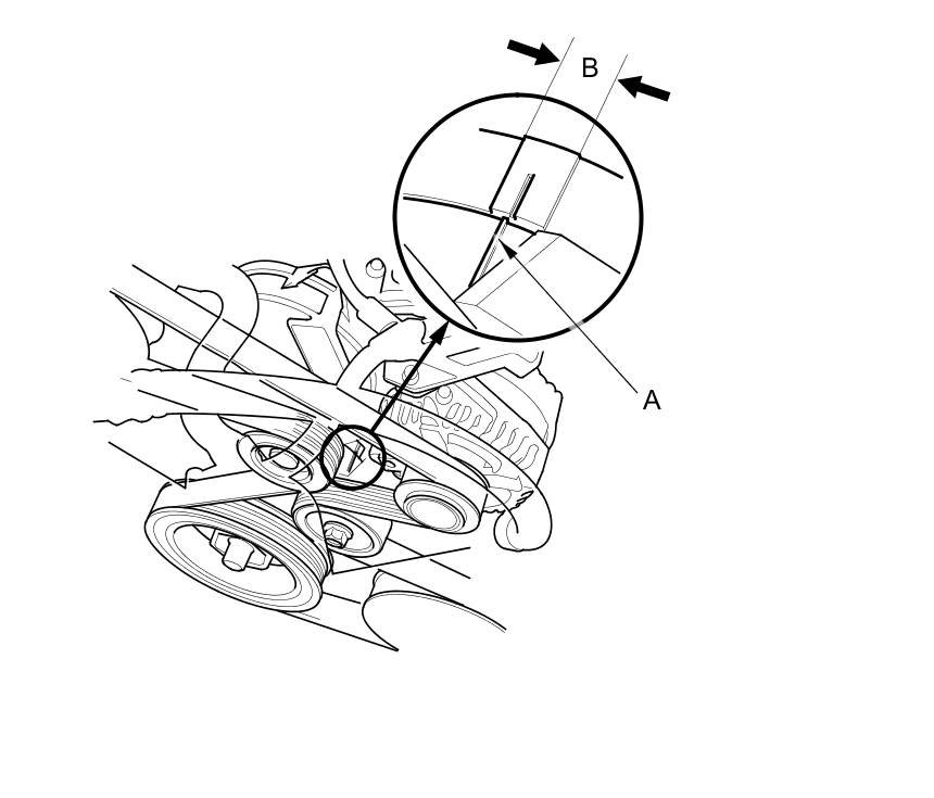2. Check that the position of the auto-tensioner indicator (A) is within the standard range (B) as shown. If it is out of the standard range, replace the drive belt Service and Repair.
