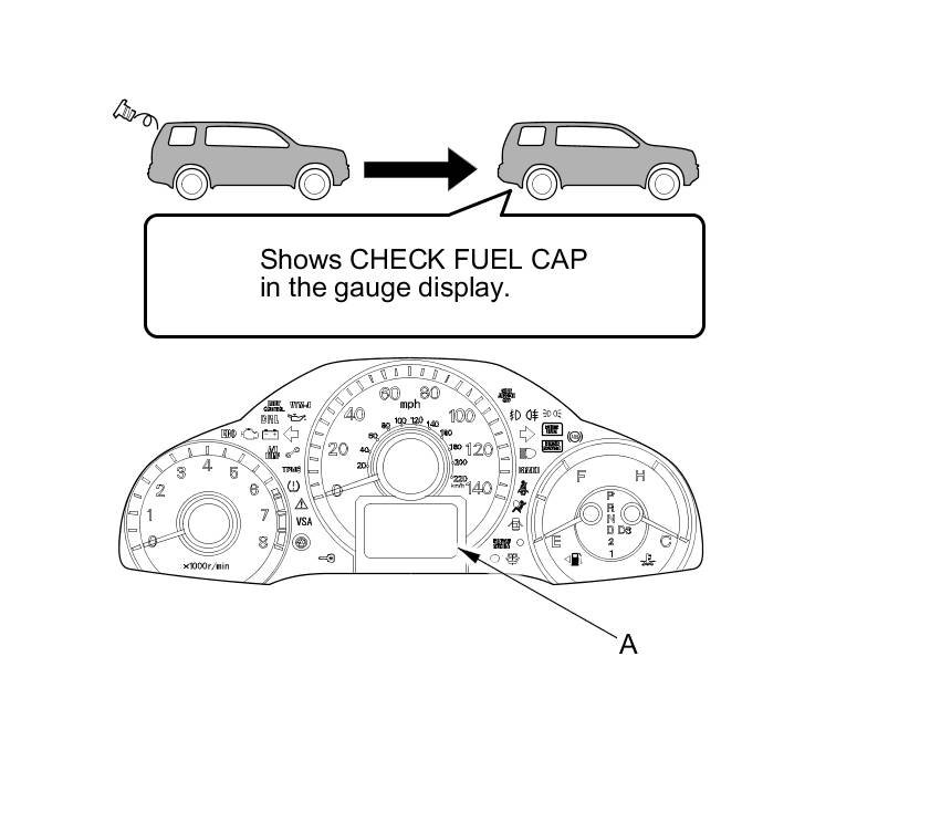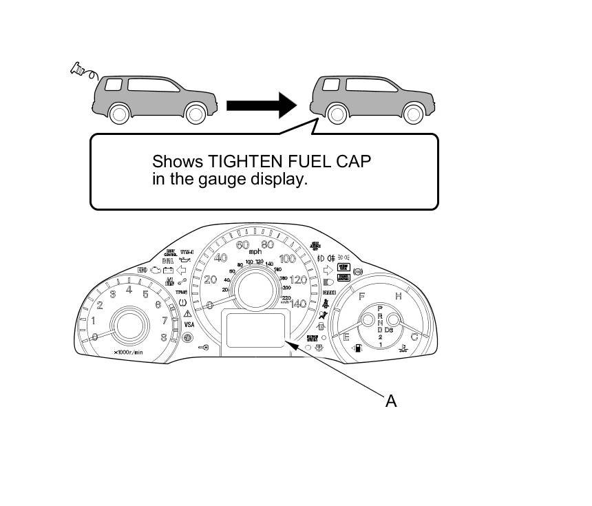 The first time a leak is detected, a TIGHTEN FUEL CAP (multi-information display model) (CHECK FUEL CAP (odometer/outside temperature display model)) message appears on the gauge display (A). To scroll to another message, press the select/reset button. The TIGHTEN FUEL CAP/CHECK FUEL CAP message appears each time you restart the engine until the system turns the message off. Turn the engine off, then replace or tighten the fuel fill cap until it clicks at least once.