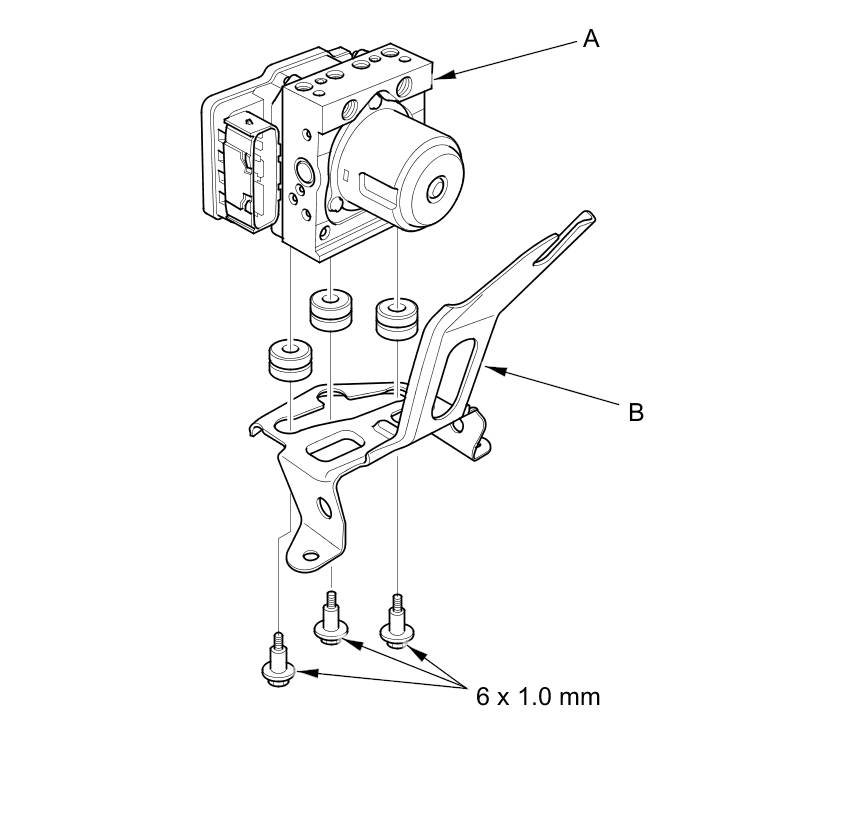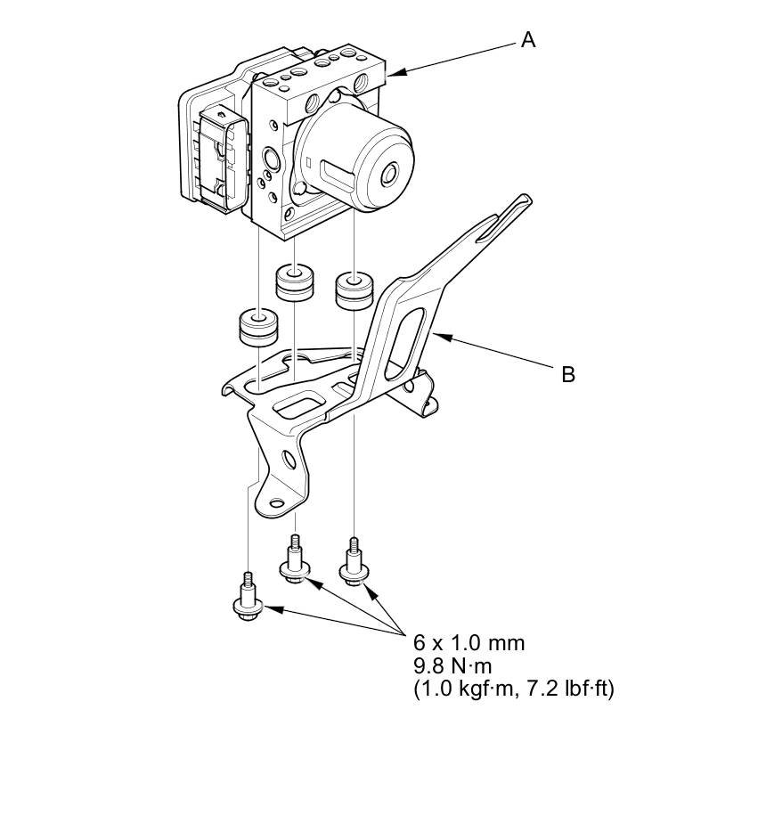 1. Install the VSA modulator-control unit (A) onto the bracket (B).
