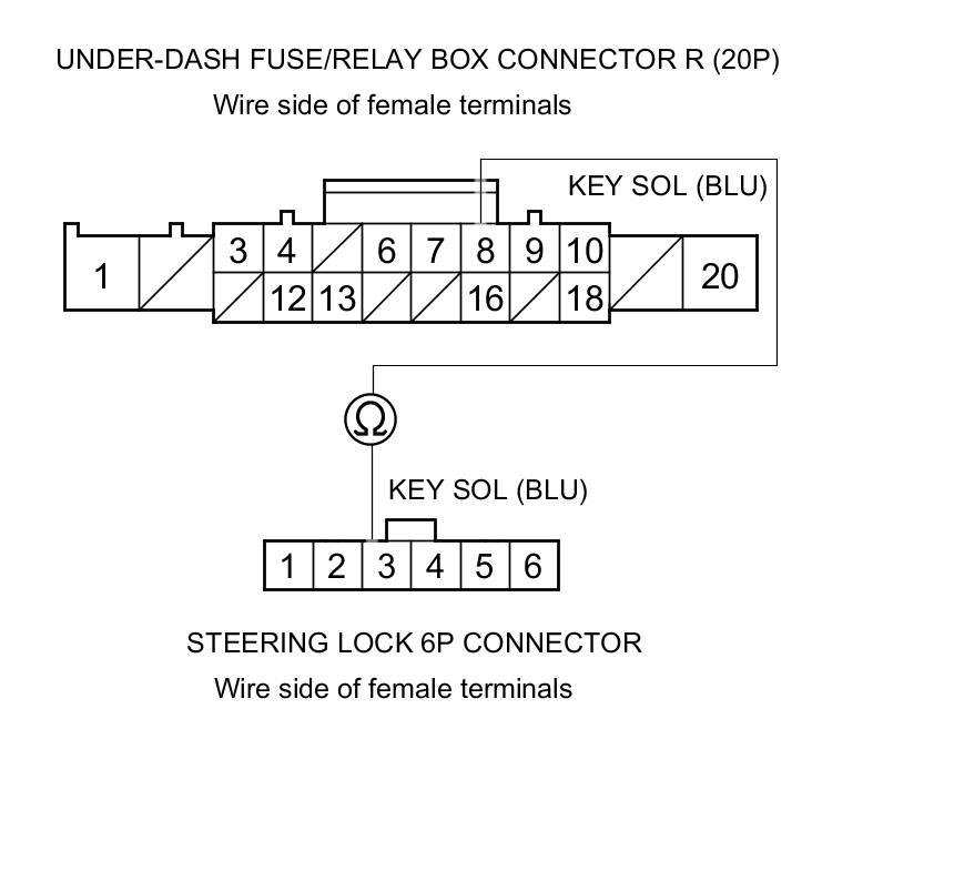 11. Check for continuity between under-dash fuse/relay box connector R (20P) terminal No. 8 and steering lock 6P connector terminal No. 3.