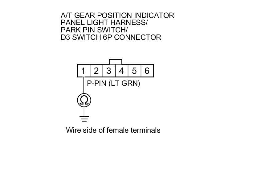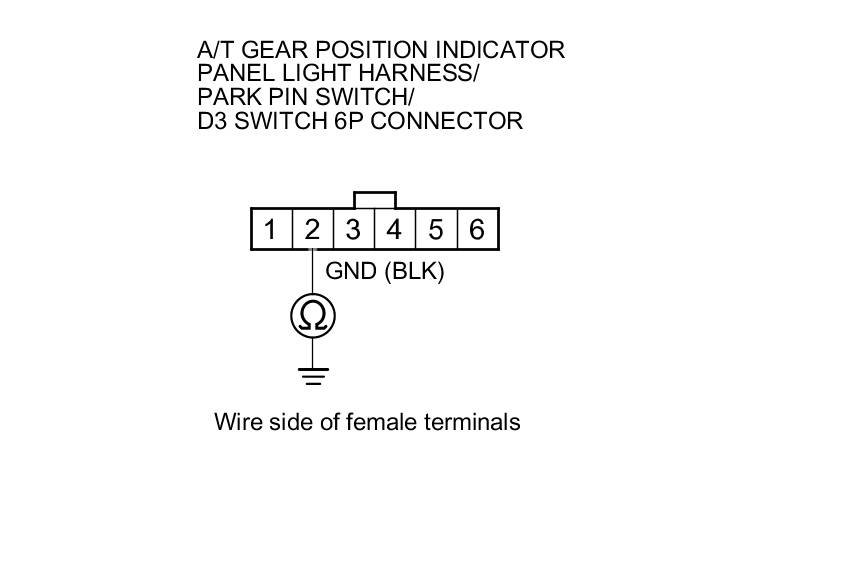 17. Check for continuity between A/T gear position indicator panel light harness/park pin switch/D3 switch 6P connector terminal No. 2 and body ground.