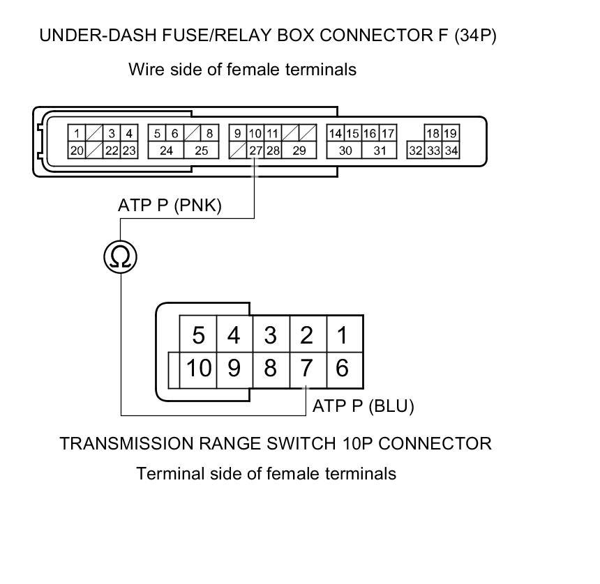 22. Check for continuity between under-dash fuse/relay box connector F (34P) terminal No. 27 and transmission range switch connector terminal No. 7.