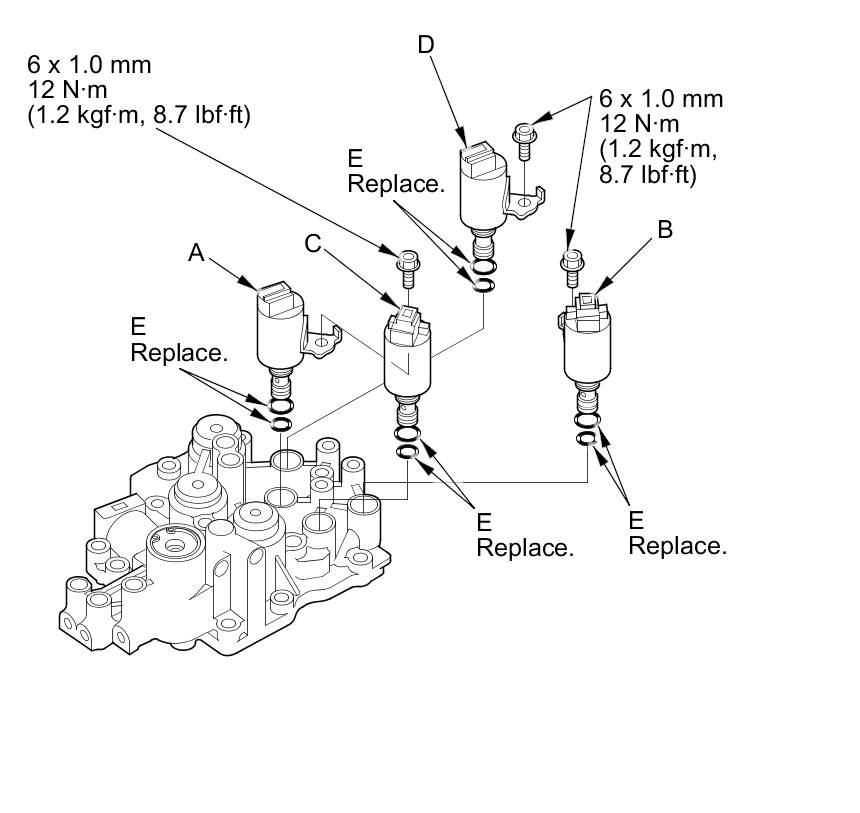 2. Install new O-rings (E) on each shift solenoid valves.