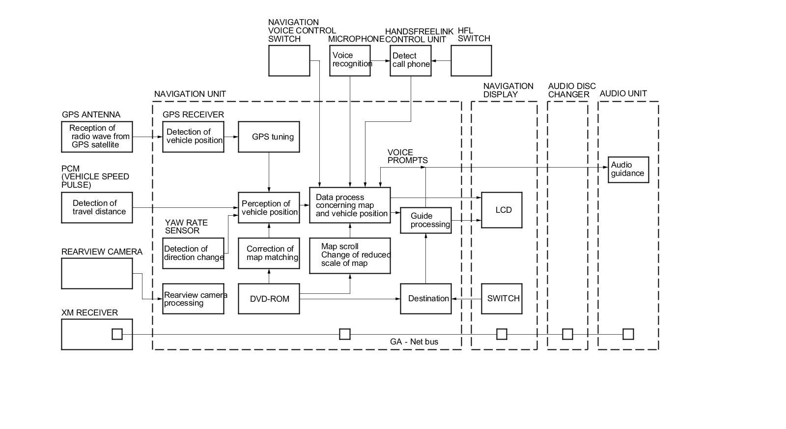 The GA-Net bus passes audio and navigation commands throughout the navigation and audio components.