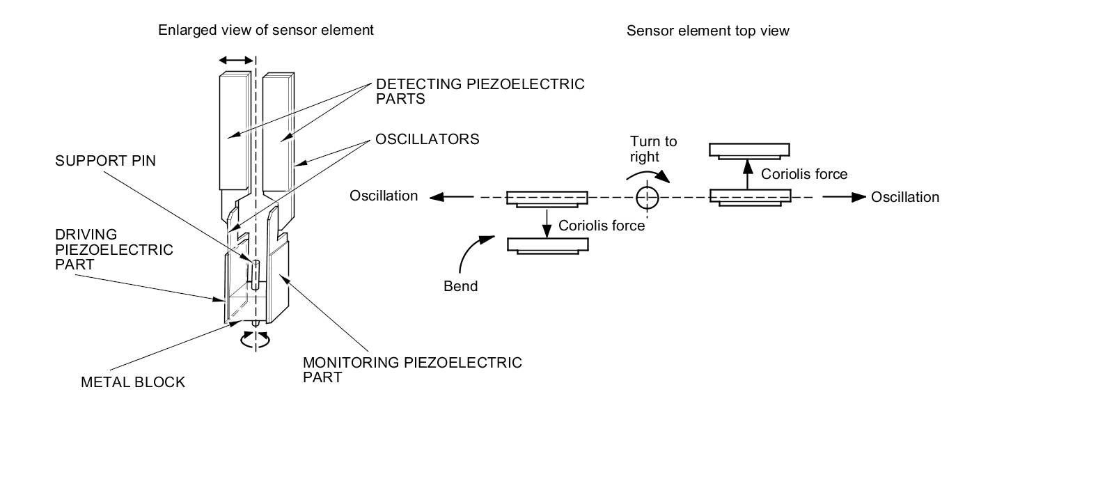 - When the vehicle turns to the right, the sensor element moves in a circular motion with the right oscillator bending forward and the left oscillator bending rearward. The amount of forward/rearward bend varies according to the angular velocity of the vehicle.