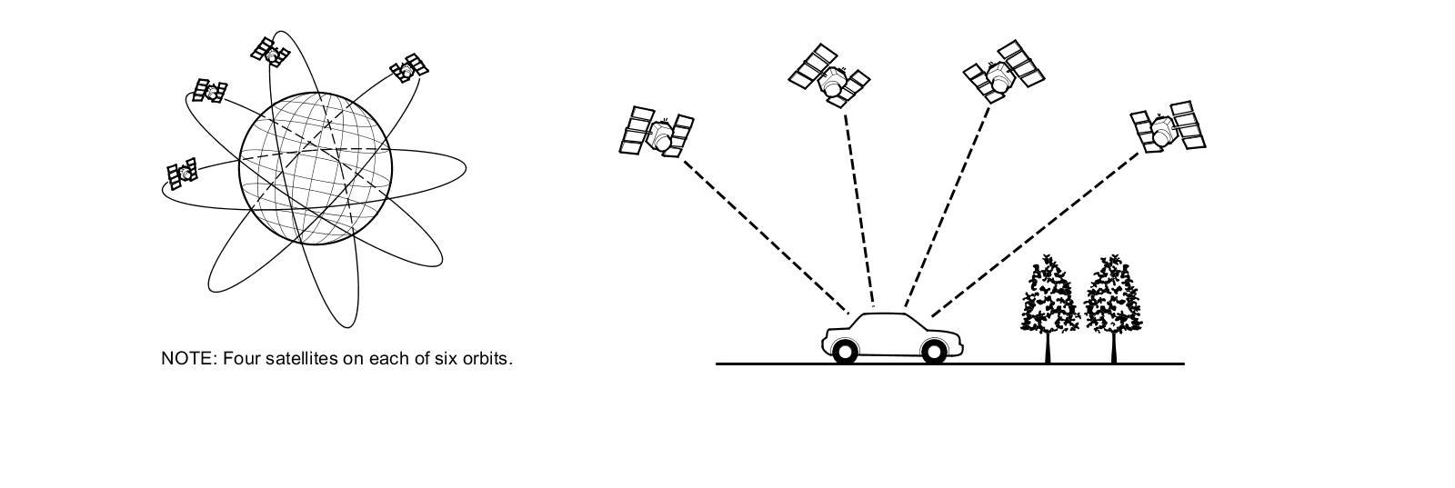 The global positioning system (GPS) enables the navigation system to determine the current position of the vehicle by using the signals transmitted from the satellites in orbit around the earth. The satellites transmit the satellite identification signal, orbit information, transmission time signal, and other information. When the GPS receiver receives a signal from four or more satellites simultaneously, it calculates the current position of the vehicle based on the distance to each satellite and the satellite's positions in its respective orbit.
