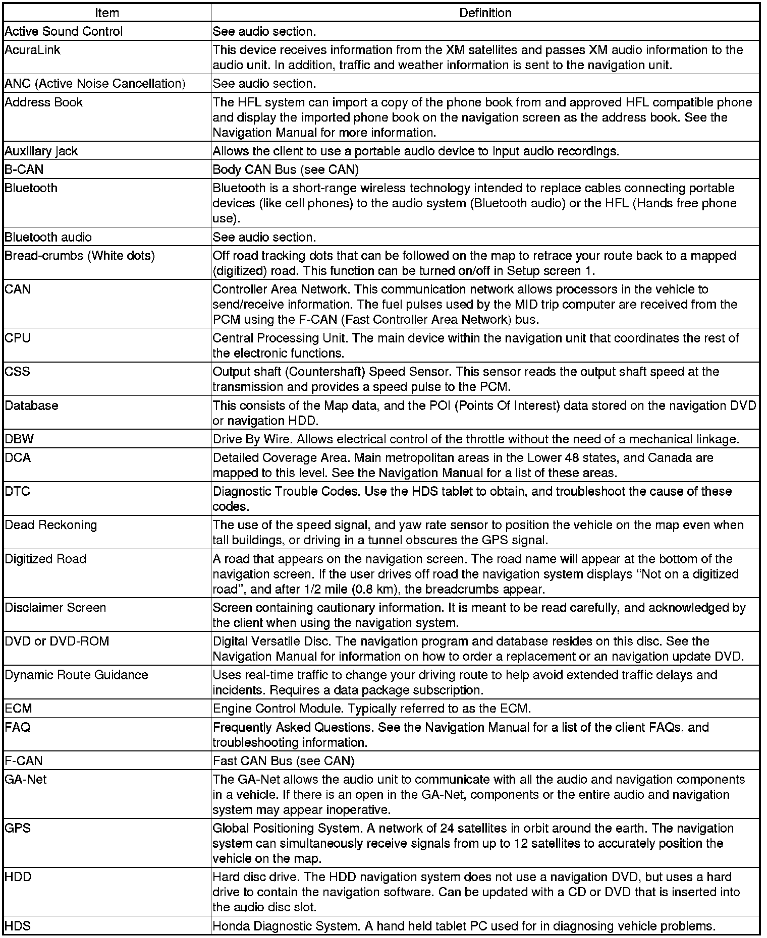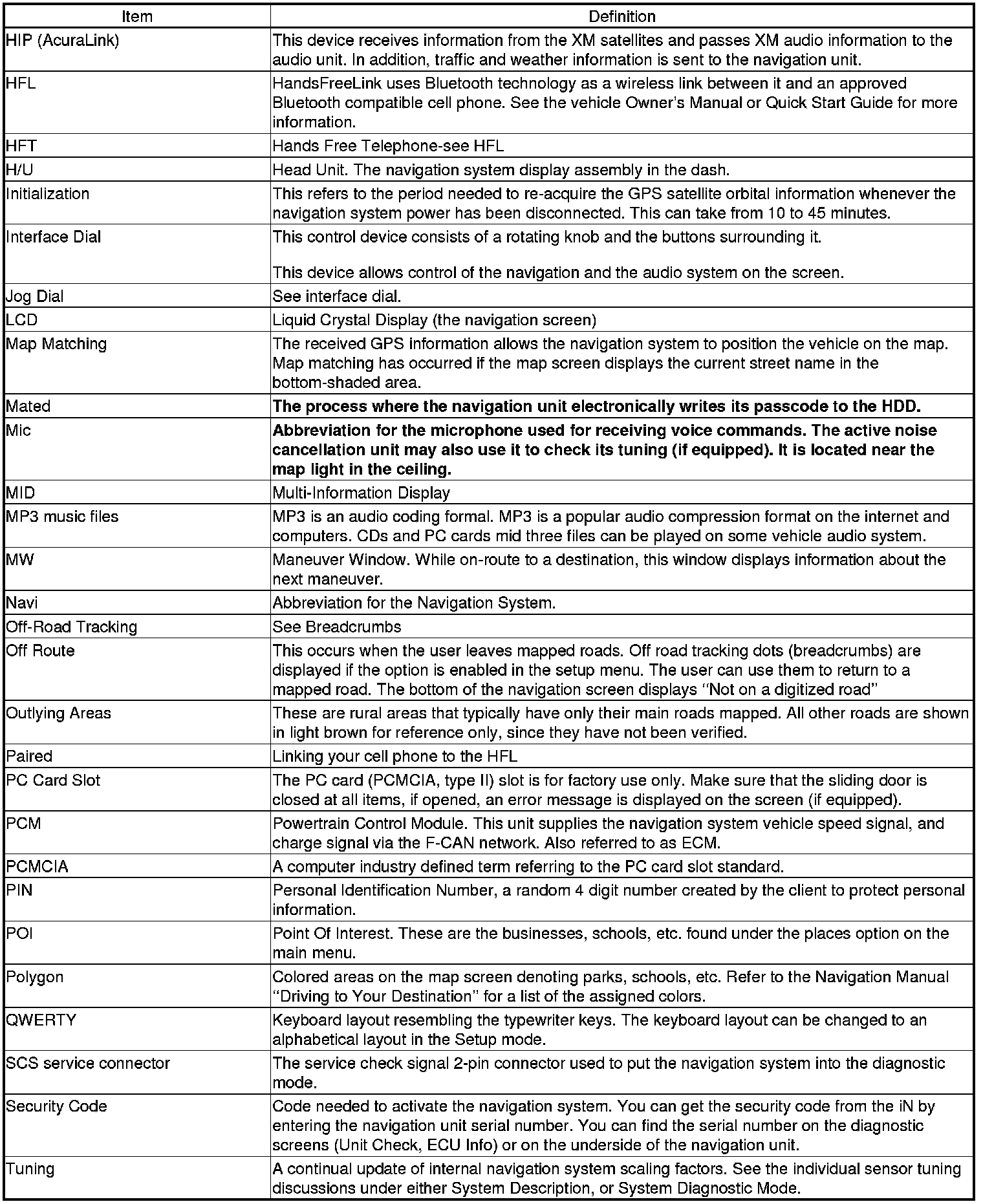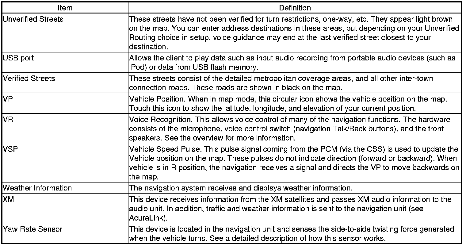 The following is a glossary of terms pertaining to the Voice Recognition Navigation System.