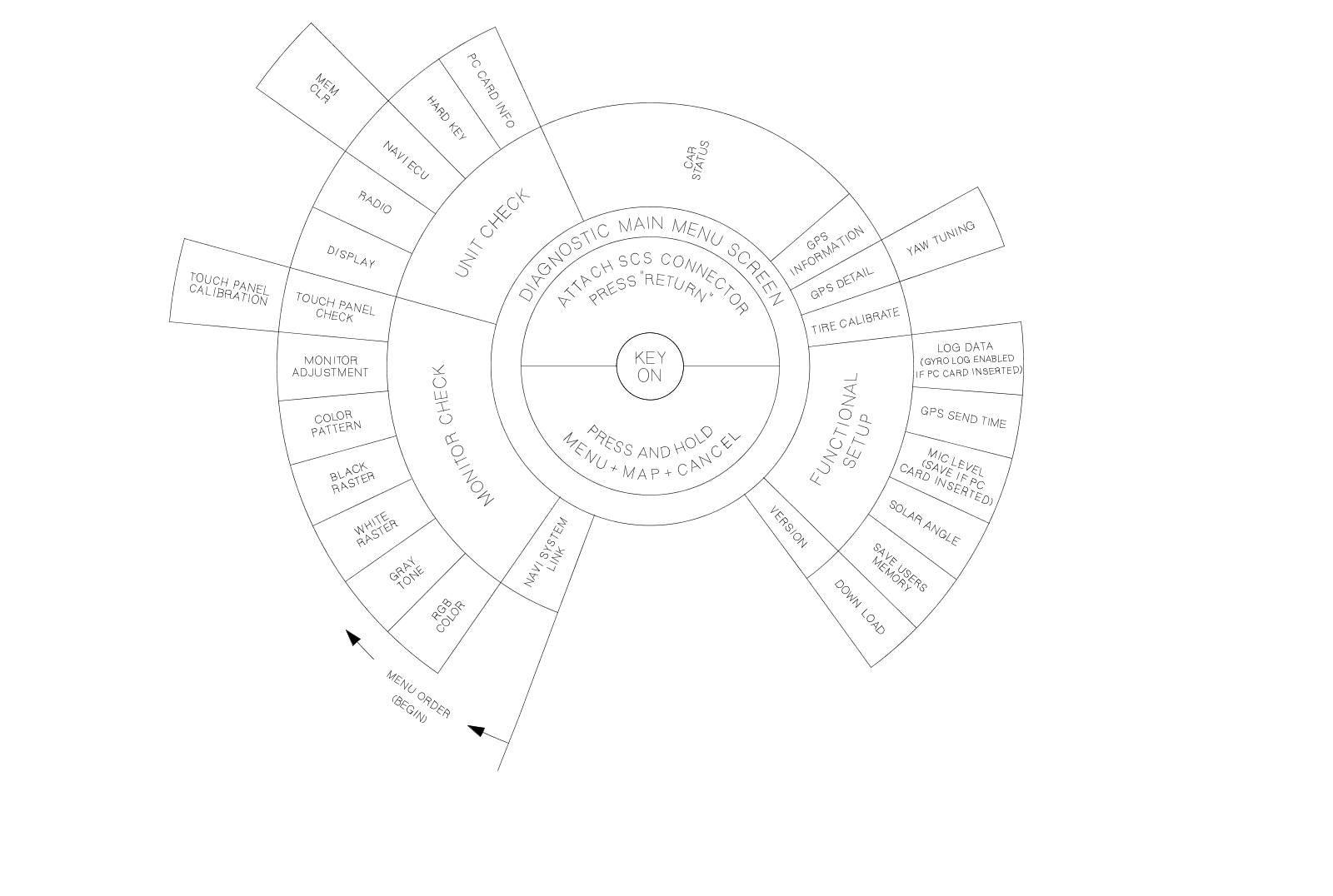 This diagram shows the diagnostic slice of the System Function Diagram. It has the diagnostic features of the navigation system starting at the center and working outward in layers. The diagnostic starts at "Key ON," and then displays the Diagnostic Main Menu (Select Diagnosis items) after:
