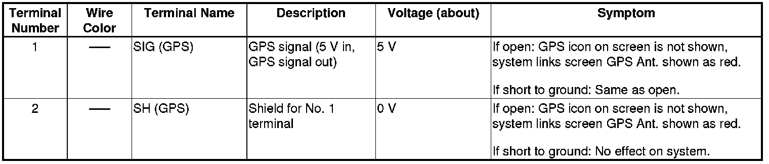 The GPS receiver is built in the navigation unit. It calculates the vehicle position by receiving the signal from the GPS antenna. The current time, vehicle position and signal reception condition is transmitted from the GPS receiver to the navigation unit to adjust vehicle position.