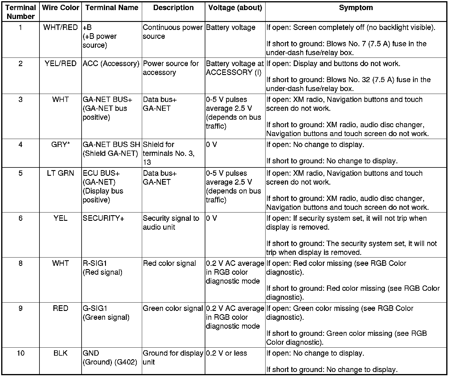 The GA-NET II communication bus passes information back and forth between the navigation display unit, the navigation unit and the audio system. The information passed on this bus is audio settings directed by the navigation unit.