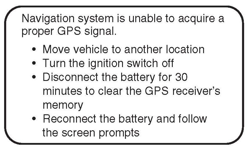 These issues could arise during the PDI or after installing replacement parts to repair the system. Refer to the navigation manual or the technology reference guide for basic operation.