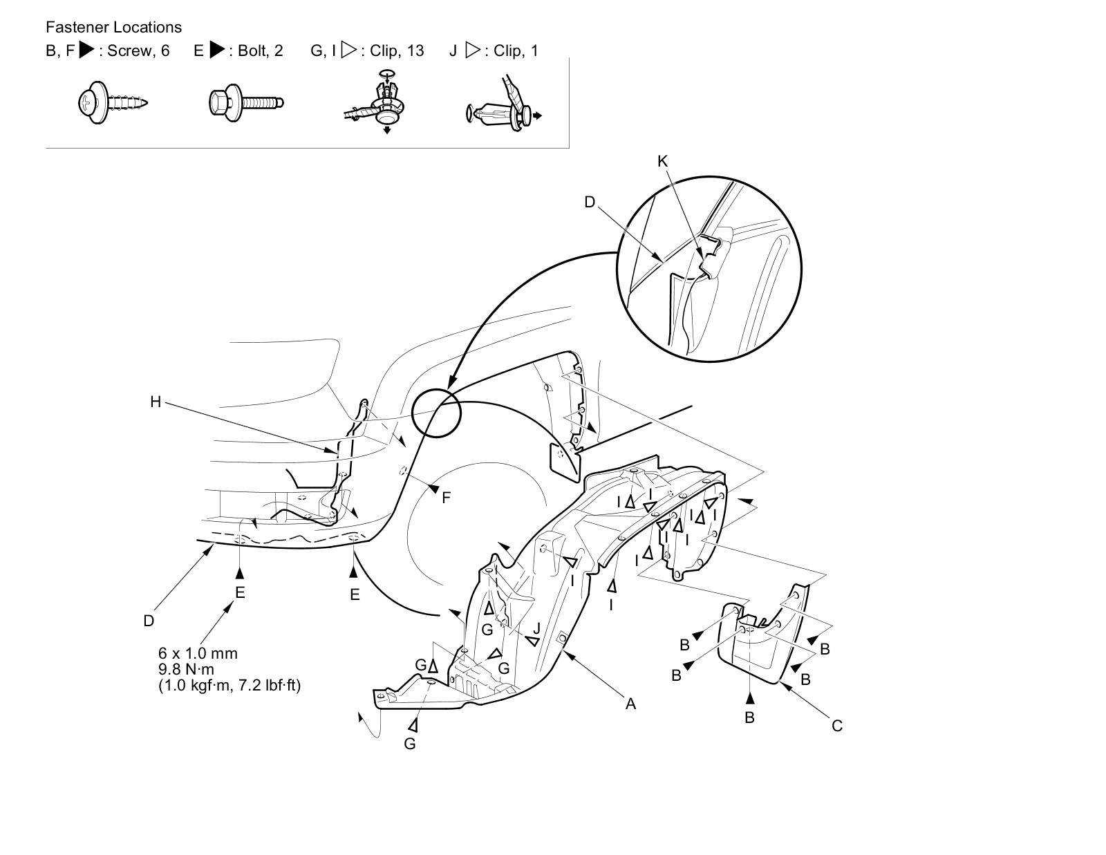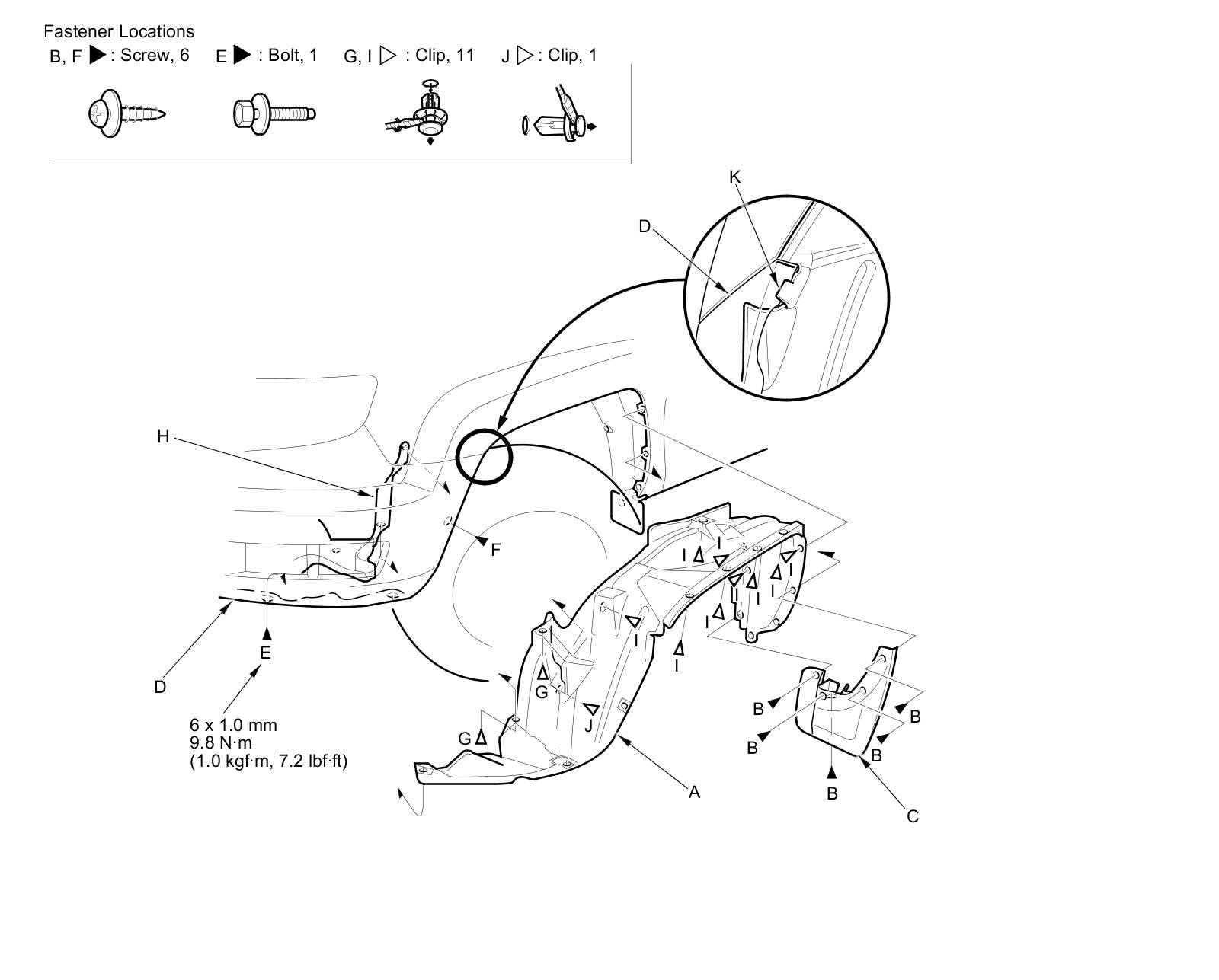 3. From the wheel arch, remove the clips (I, J) securing the front inner fender (and the splash shield) to the body.