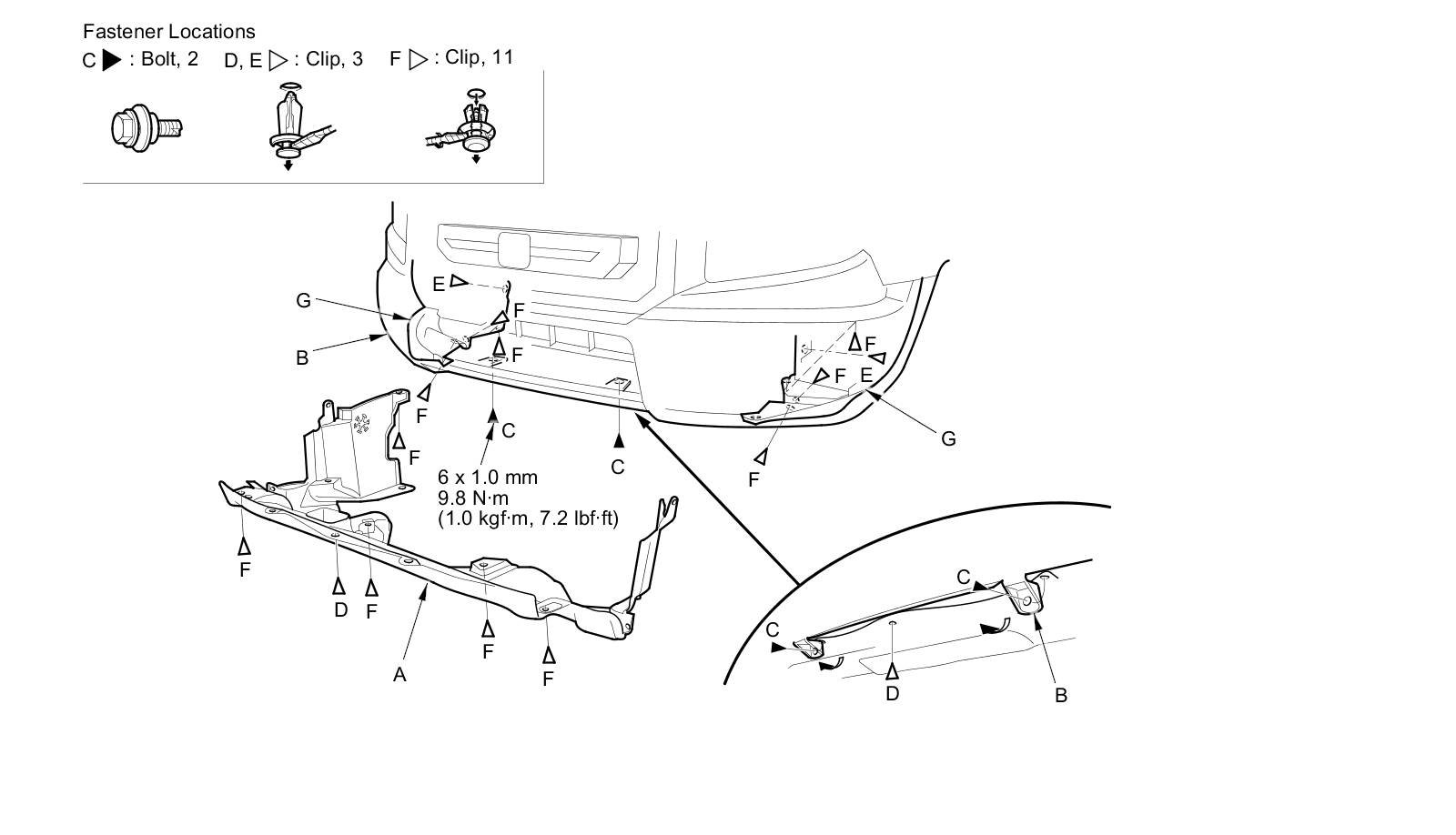 1. From under the front bumper (B), remove the bolts (C), then turn down the bumper, and remove the clip (D).