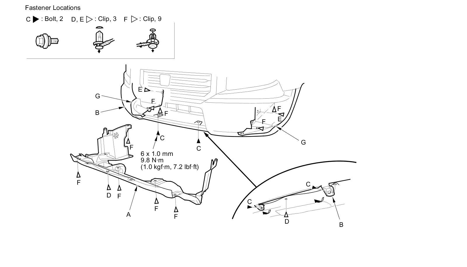 2. Remove the clips (E, F) that secure the front inner fender (G) and the splash shield to the body.