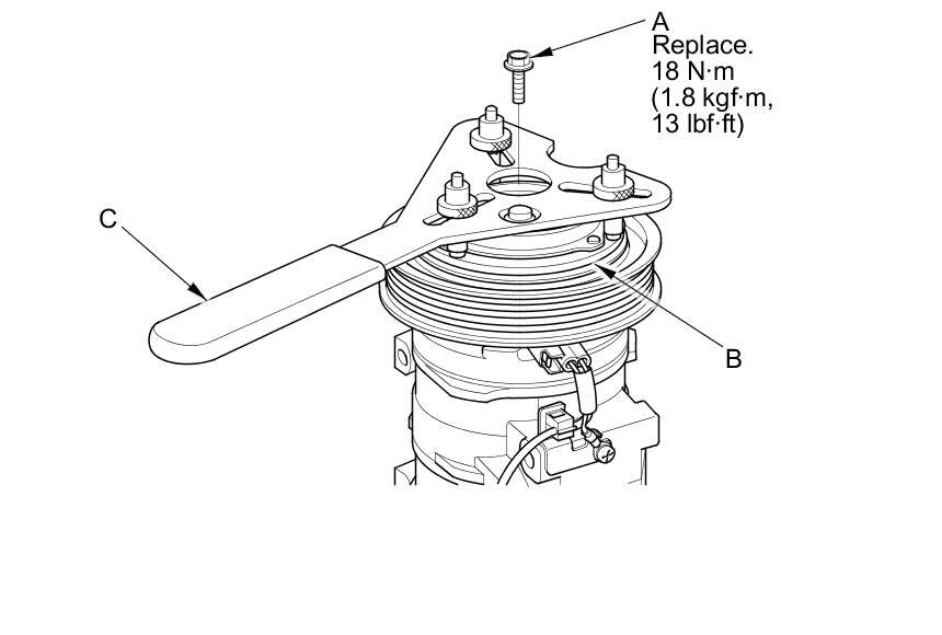 1. Remove the center bolt (A) while holding the pressure plate (B) with the A/C clutch holder (C).