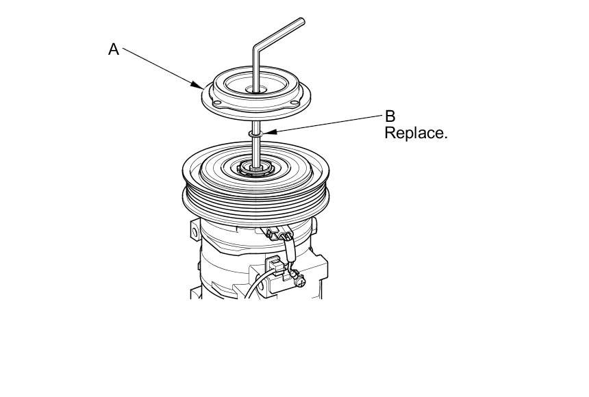 - When replacing the clutch set, place a trial stack of shims, 1 mm total thickness, on the A/C compressor shaft. Install the pressure plate, and check its clearance Testing and Inspection. If the clearance is not with specification, add or subtract shims as needed.