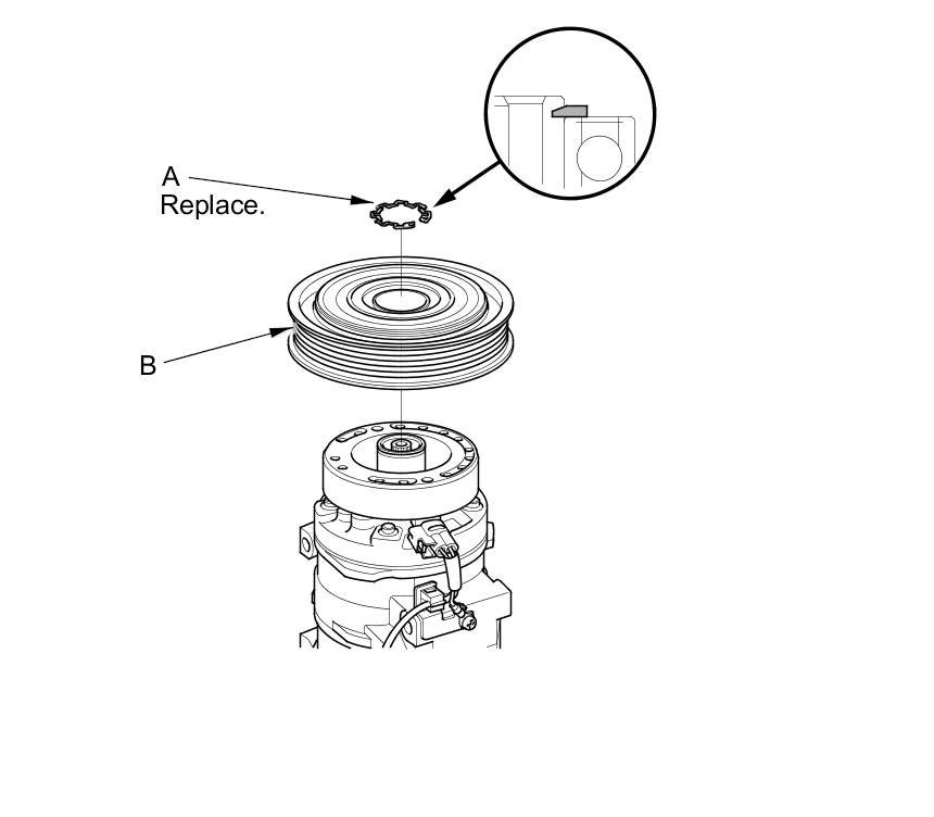 3. If you are replacing the field coil, remove the snap ring (A) with snap ring pliers, then remove the pulley (B). Be careful not to damage the pulley or the A/C compressor.