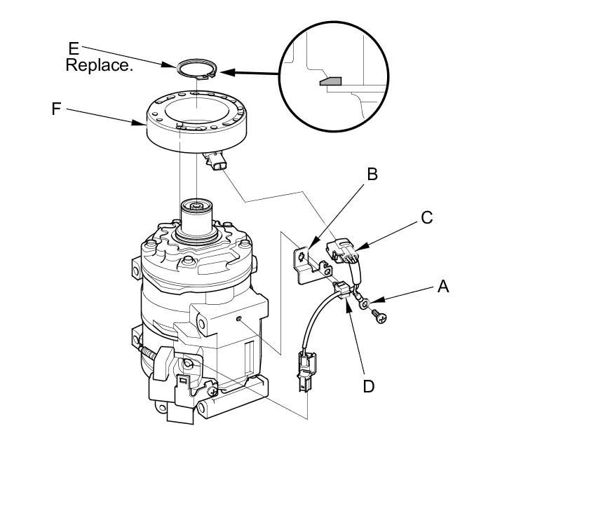 4. Remove the screw from the field coil ground terminal (A) and bracket (B). Disconnect the connector (C) from the field coil, then detach the wire harness clip (D). Remove the snap ring (E) with snap ring pliers, then remove the field coil (F). Be careful not to damage the field coil or the A/C compressor.