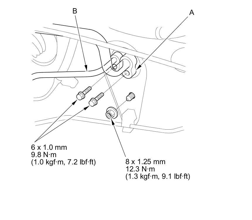 2. Remove the bolts and nut, then disconnect the suction line (A) and receiver line (B) from the evaporator core.