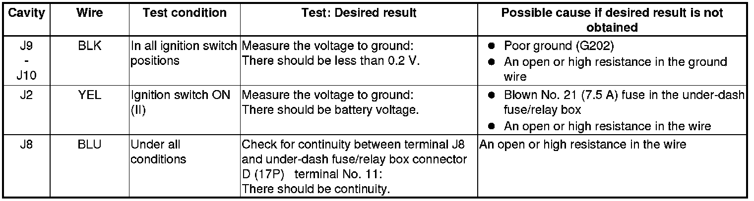 7. Reconnect the connector to the under-hood fuse/relay box, and do the following input tests: